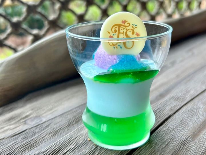 “魔法の泉が導くディズニーファンタジーの世界”をイメージした、美しいビジュアルのデザート。色鮮やかなライムのゼリーとヨーグルトムースに、ファンタジースプリングスのロゴをデザインしたチョコがトッピングされています。