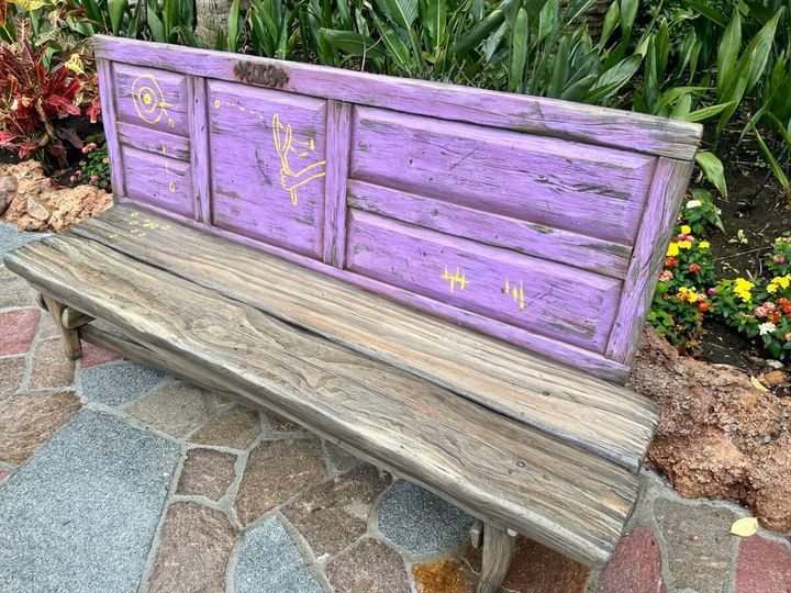 レストラン「ルックアウト・クックアウト」の近くにあるベンチは、落書きされたようなデザインが可愛い!
