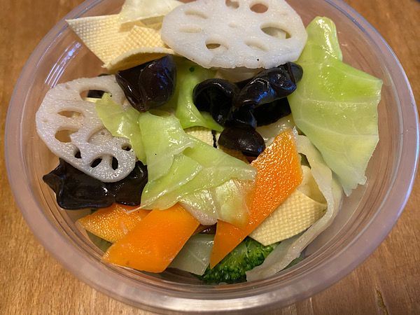 季節野菜の塩とごま油和え 280円 このお値段でこの野菜の量!びっくりしました。うっすら塩味にたっぷりごま油がちょうどいいです。小食の方ならこれだけでいいかも!?木耳の量は半端なく入ってますし、下にはブロッコリーやカリフラワーも入っていました。