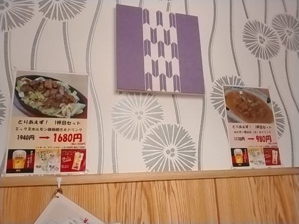 4人席の椅子席に通されました。「和」の雰囲気のデザインと木の感じが落ち着きます。 お得なランチメニュー3品の中から、1番人気の『本日のランチメニュー 焼き魚とから揚げとホルモン煮込み定食』を。ホルモンは食べると翌日お肌がツヤツヤするのよね~。あ、でももっと若いときの話かも…など思いながら楽しみに待っていました。