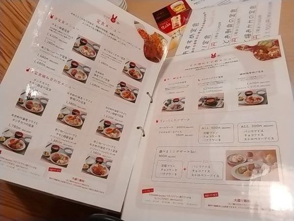 お品書きに添えてある言葉に納得。料理人さんが4人いて、美味しくて綺麗な仕上がりです。和食、洋食、韓食、とメニューが豊富でホルモンまであるのはとってもうれしいです。1品ものから定食まで選ぶのが楽しい。 子ども向けのメニューもあるので家族連れの利用もいいですね。 店内のウサギさんマークや置物があり、可愛く飾ってあります。