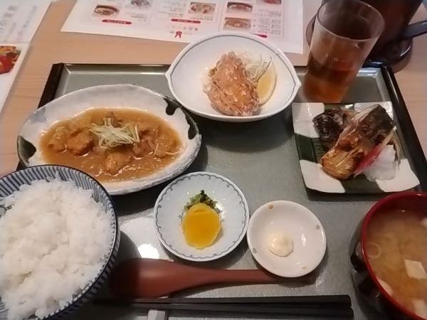 メインが3つって欲張りすぎでしょうか。 来ました、来ました。 思った以上のボリュームです。 焼き魚はパリッと良い焼き加減。皮までパリパリ。 から揚げは大きくてサクッと素材の味が美味しい。上品な1品。 そしてもつ煮込みは生姜とニンニクが効いていて味噌みぞれ味。もつが柔らかくて溶けていきます。 ごはんのお代わりもしたいくらいでした。2杯目いくか、ドリンク1杯あればちょうど良い感じでした。