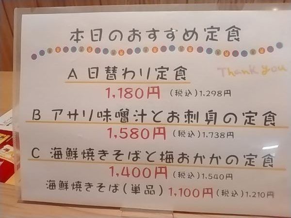 とにかくメニューがたくさんあるので、毎日来てもよさそう(笑) チキン南蛮、手ごねハンバーグ、海老フライ、お刺身、天ぷら、塩さば、シウマイ、から揚げ、サムギョプサル、焼きそば、ガパオライス、カツサンド…… 定食がバランスよく食べられるのでお勧めですが、ホルモン煮込み定食 小 880円(税抜)~ 手ごねハンバーグと大きめの海老フライ定食1,980円(税抜) まで、その日の気分に合わせて選べます。