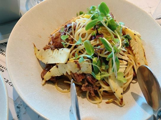 グリルされたタケノコがとても新鮮でおいしい!たっぷりの具。スプラウトがピリッと効いて、これまたおいしい!