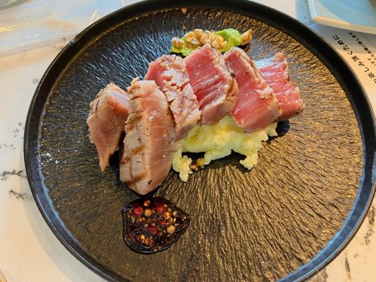 軽くグリルされて、マグロのいい脂身がのっておいしい~!下にマッシュポテト、ペッパーソースとせりのソースをつけていただきます。(こんなマグロ料理初めて!感動!)(3人分)