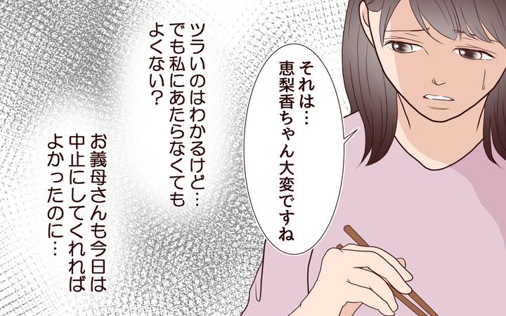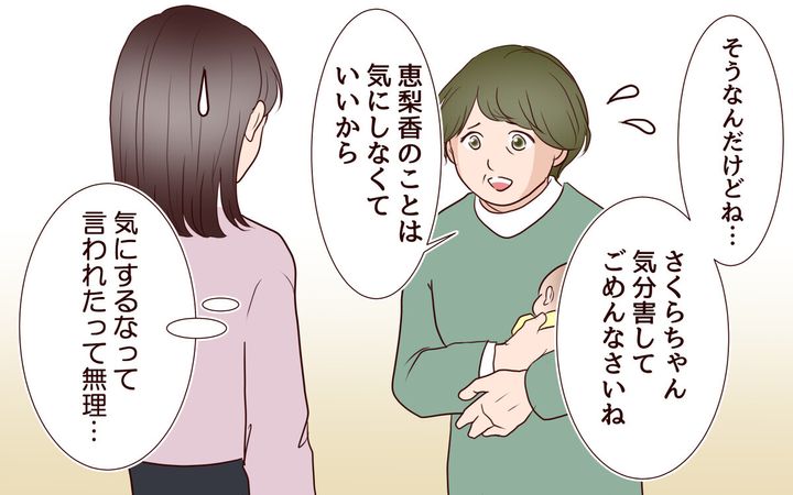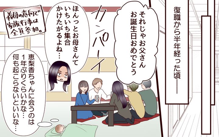 そんななか、義父の誕生日にさくらは家族で義実家に行くことに。恵梨香と会うのは1年ぶりでしたが、また子持ち批判が始まったのです。