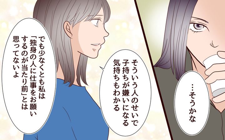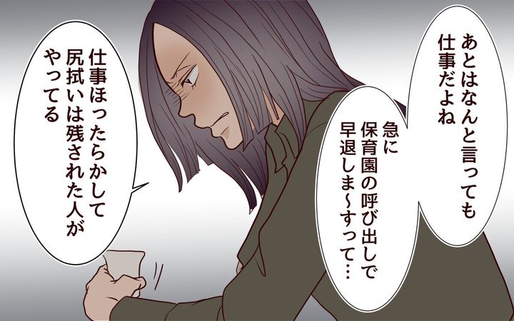 ・仕事を押しつけられ、子持ちの人を嫌うのは構わないが、完全に八つ当たり。仕事の流れは上司に相談するべきだし、子持ちの相手が違うのに、主人公に当たるのは、あり得ない。