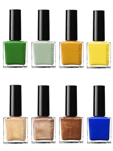 ▲アディクション「ザ ネイルポリッシュ +」 新8色(うち限定6色) 12mL 各¥2,420(税込) 上段左から109C Jade Tiles(限定色):翡翠の透明感を持つ鮮やかなグリーン、110C Succulent Green(限定色):多肉植物の褪せ感を宿すまろみグリーン、111C Moon Cactus(限定色):サボテンの花のようにエネルギッシュなイエロー、112C Polished Ocher(限定色):時を刻む古城のようなイエローオーカー。下段左から041P Sunlit Sands:砂金のように神秘的なゴールドベージュ、113SP Antique Brass(限定色):真鍮の輝きをまとったアンティークブロンズ、114SP Clay Wall(限定色):ゴールドが煌めく赤土のブラウン、042C Moroccan Blue:視線を集めるアイコニックなブルー