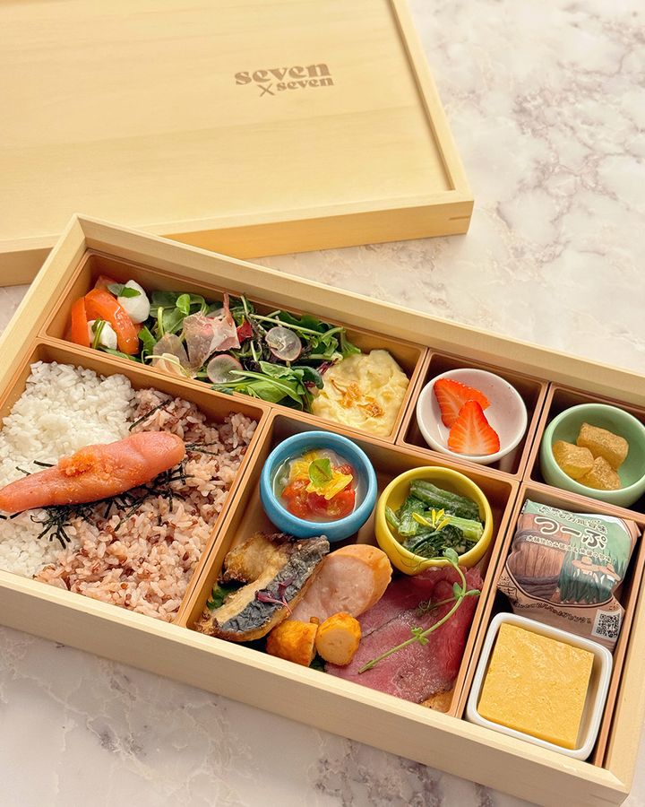 朝ごはんもお部屋でゆっくりと。彩り豊かで目にも舌にも美味しい「朝食 BOX ¥3,000」は、糸島二条の二色米や、雷山卵の玉子焼き、明太子、糸島葉ねぎのスープなど、地元の幸がたっぷり。※事前予約必須