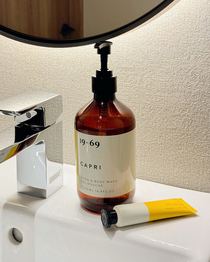 スウェーデン人アーティストが手掛けるフレグランスブランド「19-69」のハンドソープやシャンプー、クリームを導入しており、細部にまでセンスが光ります。
