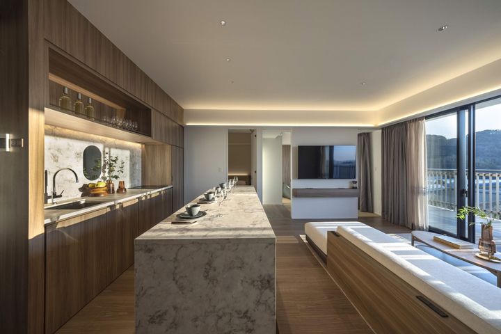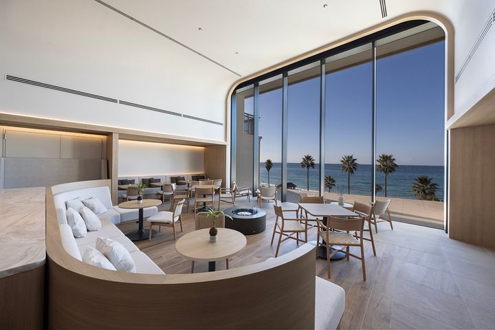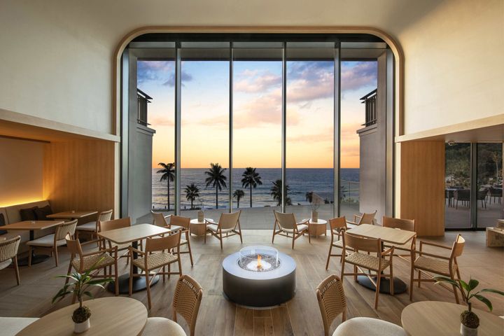 ホテルのデザインは、海の眺望と自然を際立たせるよう、ニュートラルなカラーを限定して採用。室内の自然光の反射を最大限に生かす明るい石造りの天板や、温かみのある木目調を基調とした客室は、室内でもリラックスして素晴らしい景色が堪能できるように演出されています。