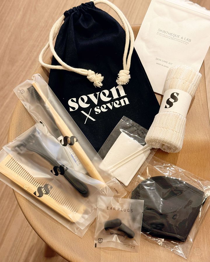 ビーチにも持ち運べるオリジナルポーチを開けると、気の利いたアメニティたちが。賑やかなグループステイだからこそ、耳栓やアイマスクで快適な睡眠をサポート。
