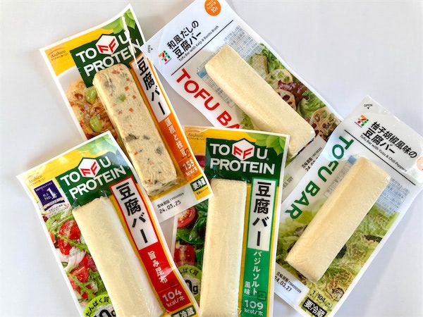 管理栄養士のともゆみです。豆腐をスティックタイプにした商品「豆腐バー」という商品をご存じでしょうか?ワンハンドで手軽に食べられて、1本で植物性たんぱく質が10gも摂取できるそう。豆腐メーカー「アサヒコ」が開発し、2020年11月に販売をはじめて以来、今も大ヒットしている商品です。さまざまな味のラインナップも魅力的。今回は3種類の他にセブン‐イレブンから出ている2種類も試してみます。