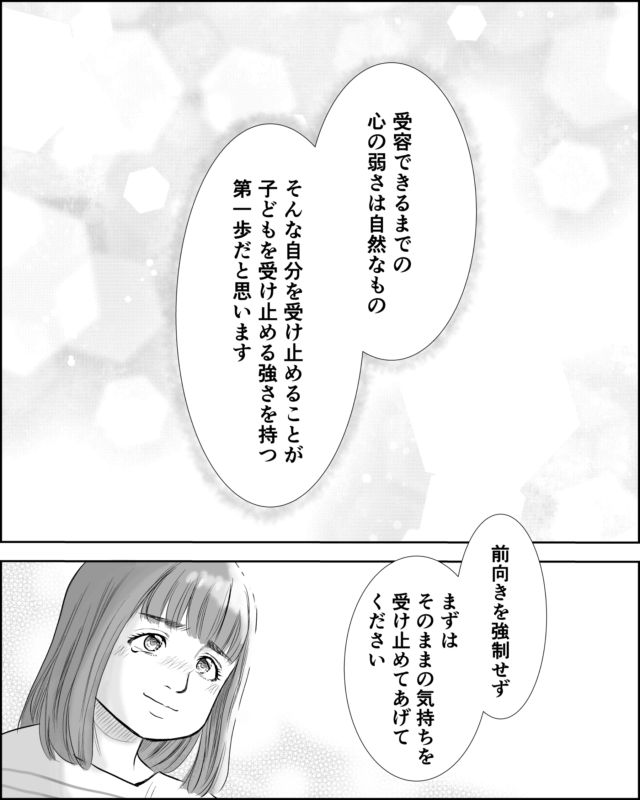 「受容できるまでの心の弱さは自然なもの、そんな自分を受け止めることが、子どもを受け止める強さを持つ第一歩だと思います。