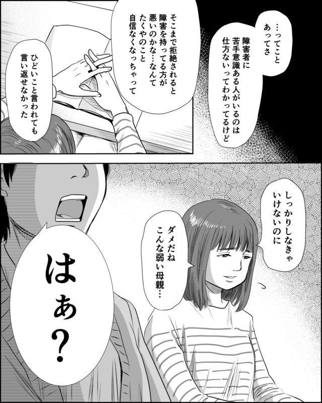 「・・・ってことがあってさ、障碍者に苦手意識がある人がいるのは仕方ないってわかってるけど、そこまで拒絶されると、障害を持ってる方が悪いのかな・・なんて、たくやのこと自信なくなっちゃって・・ひどいこと言われても言い返せなかった・・。しっかりしなきゃいけないのに・・ダメだね。こんな弱い母親・・」