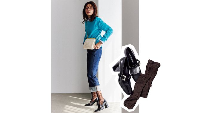 タイツ¥2,420(ぽこあぽこ)シューズ¥158,400バッグ¥137,500(ともにセルジオ ロッシ/セルジオ ロッシ カスタマーサービス)ニット¥53,900(コズ マニュファクチャード バイ ラッピンノット/ウメダニット)シャツ¥52,800(マディソンブルー)デニム¥23,100(アッパーハイツ/ゲストリスト)サングラス¥38,500(アヤメ)ブレスレット¥25,300(シーエックスシー/アマン)