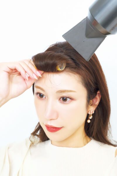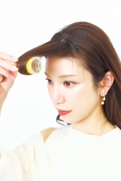もともと髪にコシがあるタイプはブローだけで立ち上がりがつくけど、細い毛や軟毛の人はカーラーが便利。ポイントは根元ギリギリまで巻いて立ち上がりをつけること。サイドはツイスト巻きにすると華やかな印象に。