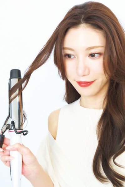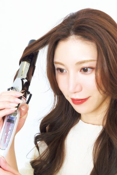 コテのフタをゆるめ、毛束を1巻きずつ抜きながら毛先までコテを移動させ、ツイスト巻きに。逆側も同様に巻く。