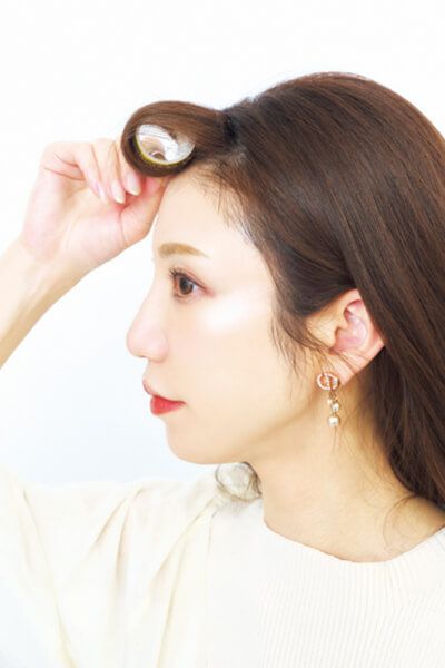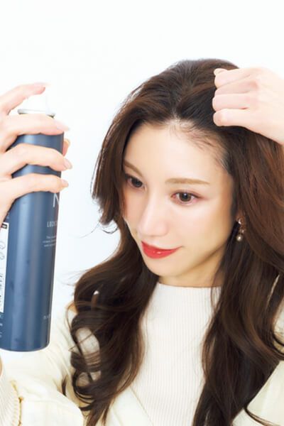 巻いた毛束をなじませたら、生え際を指で持ち上げてスプレーする。立ち上げた部分にピンポイントでかけて。