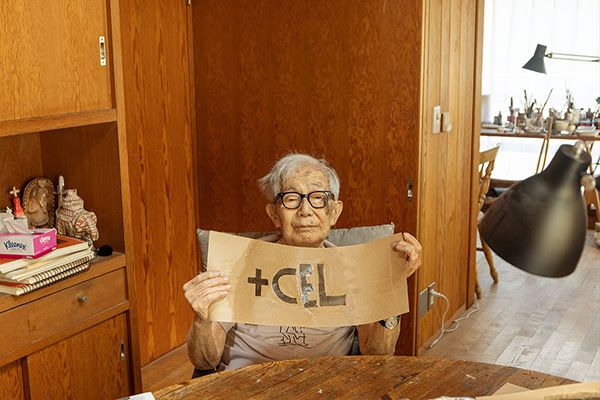 染色家でアーティストの柚木沙弥郎さん。「+CEL」のロゴも柚木さんによるもの。染色でつかう型染の技法を用いて描かれている。