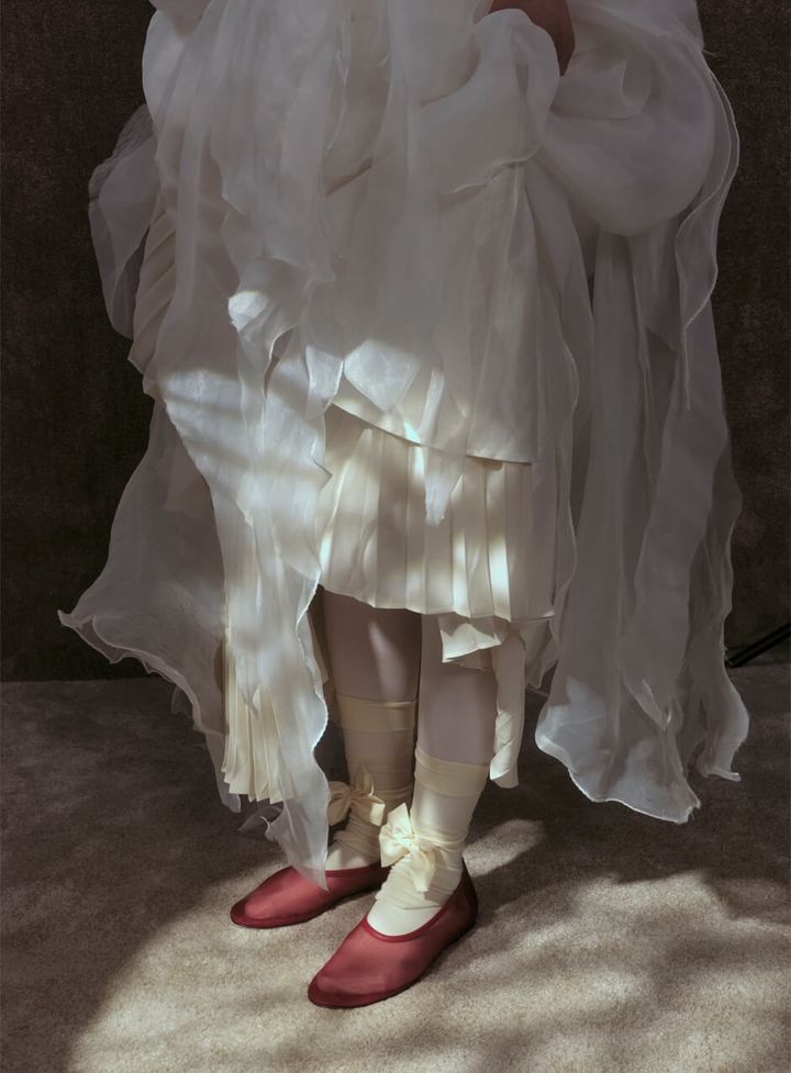 例えば、透け感のある白いドレスとアースカラーのバレエシューズの組み合わせは純粋無垢な愛を、一方でダイナミックで大きい黒い花をあしらった頑丈で構築的なオーバーコートは、より複雑で重層的な愛を表しています。