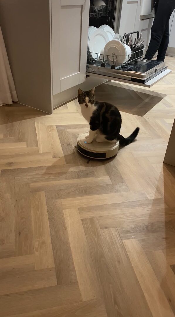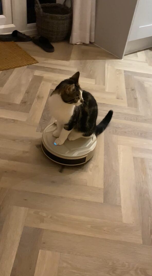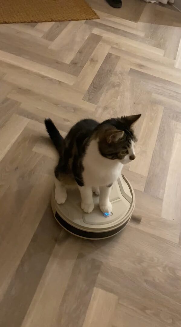 ロボット掃除機の上にいるネコ。 楽して移動できると楽しんでいるのかと思いきや・・・、どこへ移動するのか掴みどころのないロボット掃除機の動きに翻弄されていたようです!!