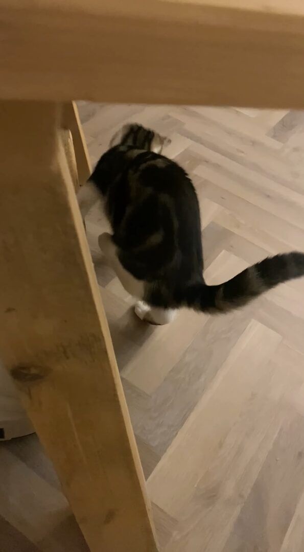 すると、ロボット掃除機は椅子の下に入っていってしまいました! これには、慌ててロボット掃除機の上から飛び降りるネコなのでした。