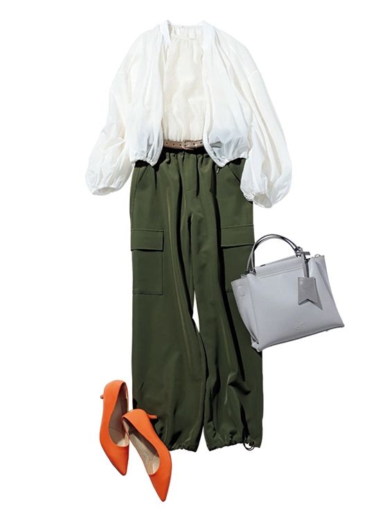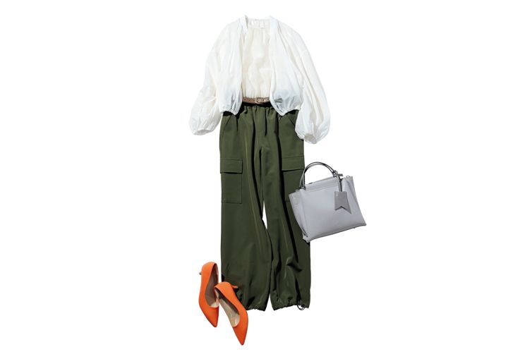 ブラウス付きワンピース(ブラウス)¥19,910/ミラ オーウェン ルミネ新宿2店 シアーブルゾン¥17,930/アンクレイヴ スタンダード(オンワード樫山) カーゴパンツ¥3,990/シューラルー、 2WAYボストン¥6,996/デッサン(ともにワールド) ポインテッドトウパンプス¥7,500/オリエンタルトラフィック(ダブルエー) ベルト¥990/GU