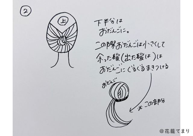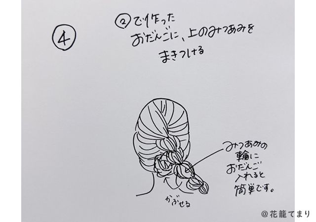 (4)(2)で作った下半分のお団子に、(3)で作った三つ編みを巻きつけます。
