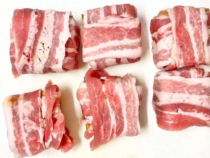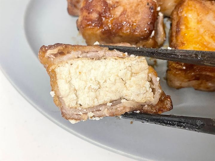 2.  豚バラ肉を厚揚げに巻き付けます。