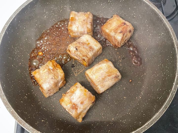 4.  全面に焼き色がついたら、取っておいた漬け込みダレを加え、蒸し焼きにします。