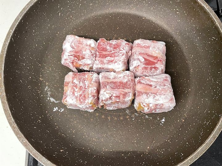 3.  片栗粉を全体にまぶしたら、巻き終わりを下にしてフライパンにおいていきます。