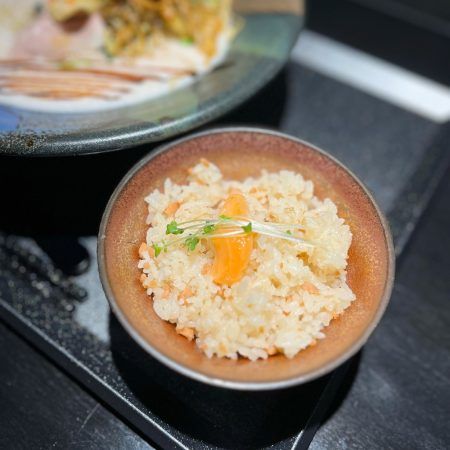 サーモンのエキスで炊き込んだ鮭飯に、フレッシュサーモンを添えて♪