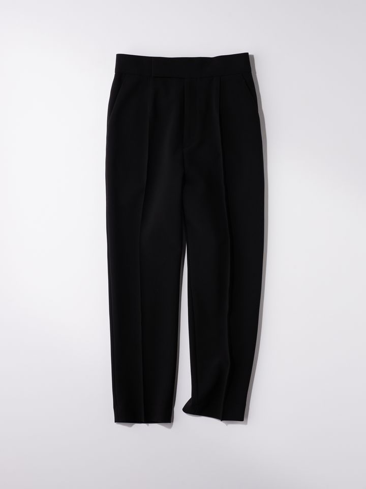 特殊なストレッチ素材を用いたコンパクトなシルエットのパンツ。ミニマムなデザインながら、シワになりづらくラインを拾いすぎずにすっきりとしたシルエットで穿けます。甘めのボリュームトップスとのコーディネートでバランサーとしても頼れるアイテム。パンツ¥24,200(TSURU By MAIKO OIKAWA)