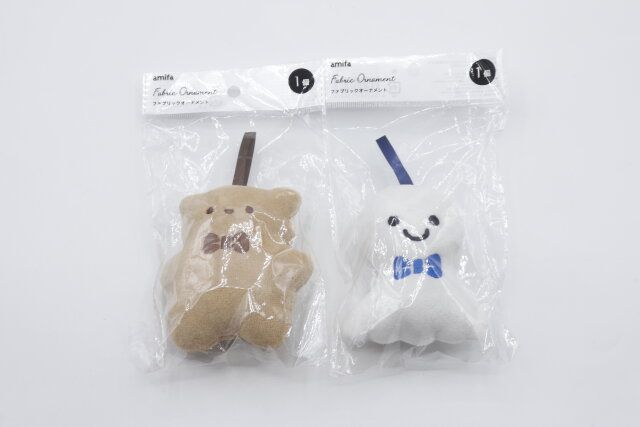 「ファブリックオーナメント ベア 大」と「ファブリックオーナメント てるてるぼうず 大」という商品で、お値段は各110円(税込)です。