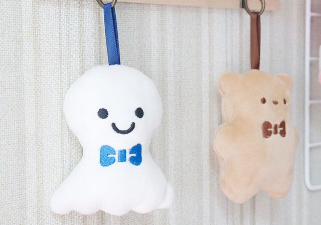 それぞれのぬいぐるみにはリボンが付いているので、このようにフックなどに掛けて飾れます。