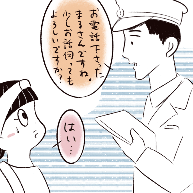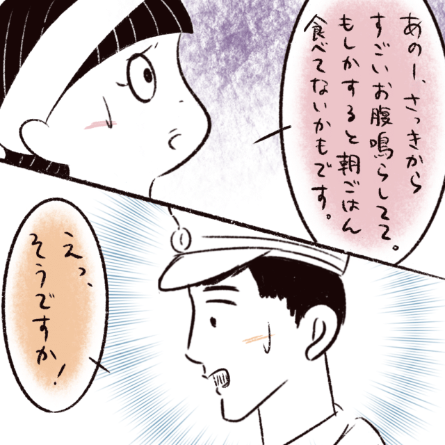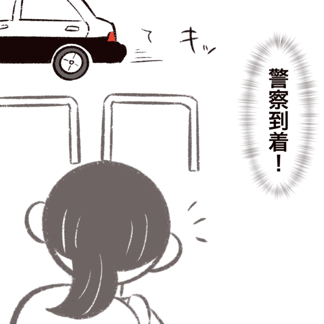 警察の到着を待つ間、おーちゃんが警察に保護されるのが初めてではないと知ったまるさんはおーちゃんの両親の想像を超えるヤバさに言葉を失います。そのとき、おーちゃんのお腹が凄い音で鳴るのが聞こえ・・・「朝ごはん食べてないのかな」と心配になったものの、ここでそれを聞いてしまうとまたおーちゃんに懐かれることを危惧したまるさんは会話を極力控えて警察の到着を待ちました・・・。