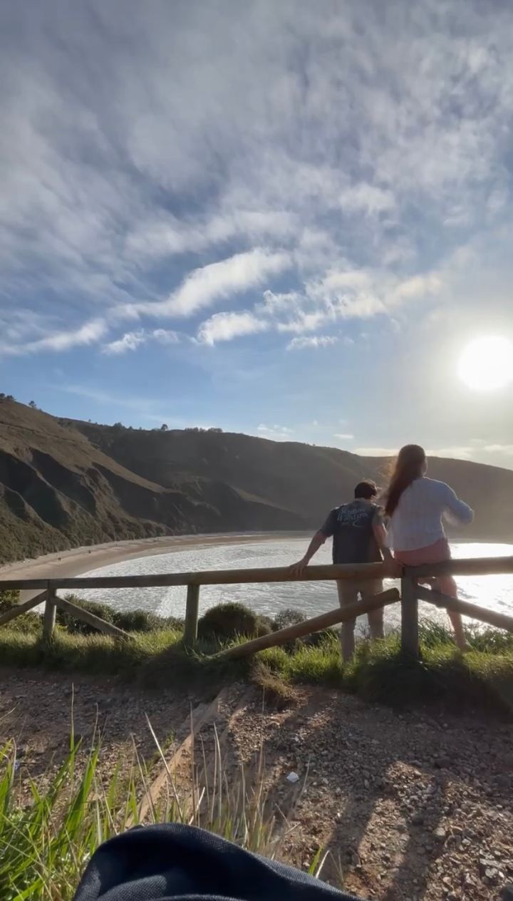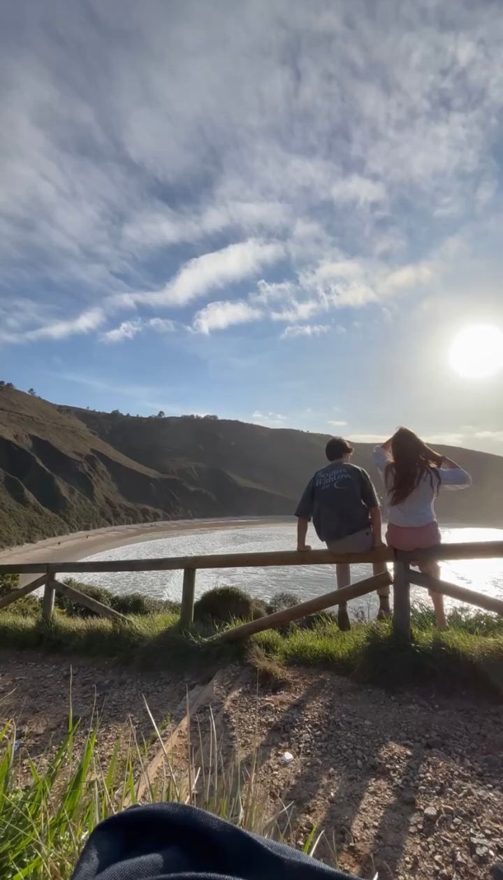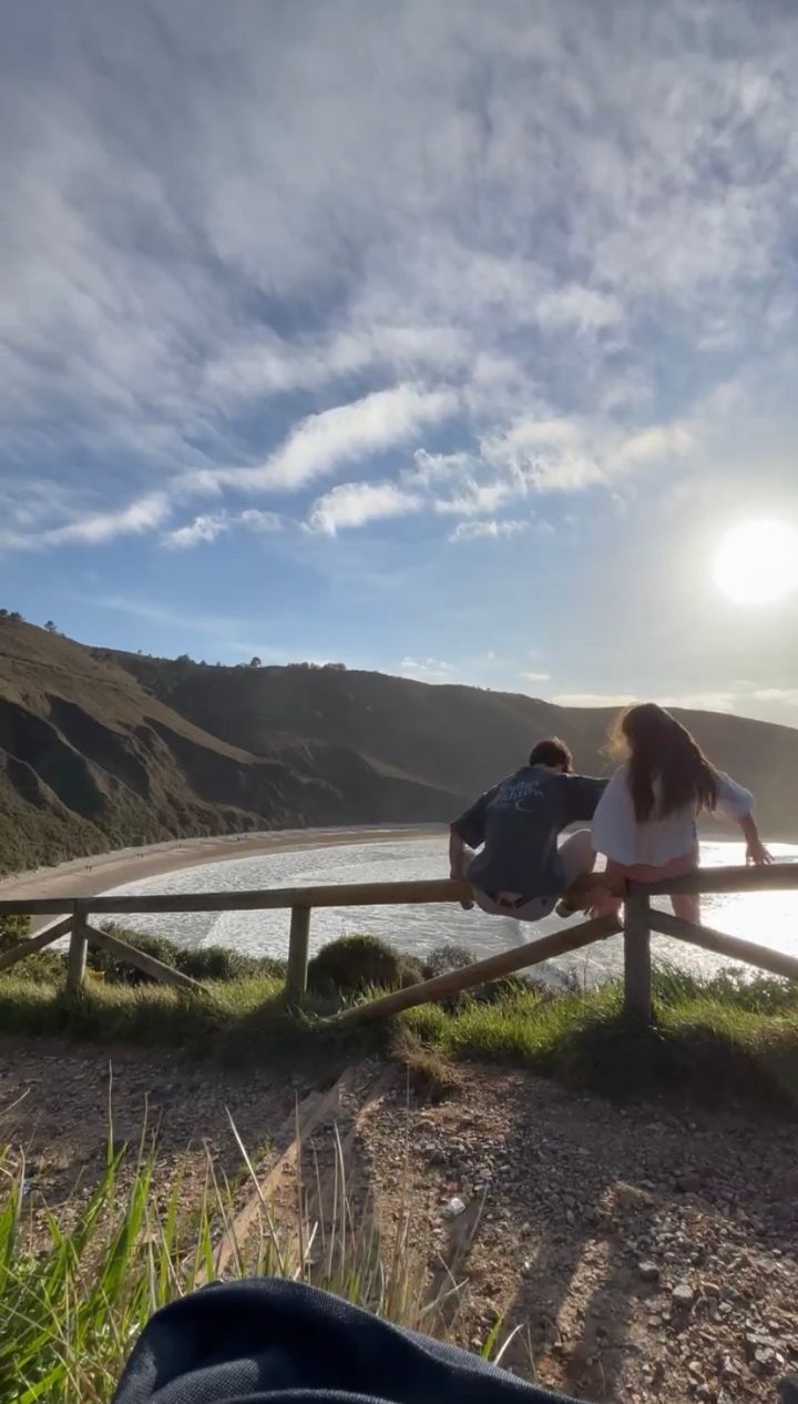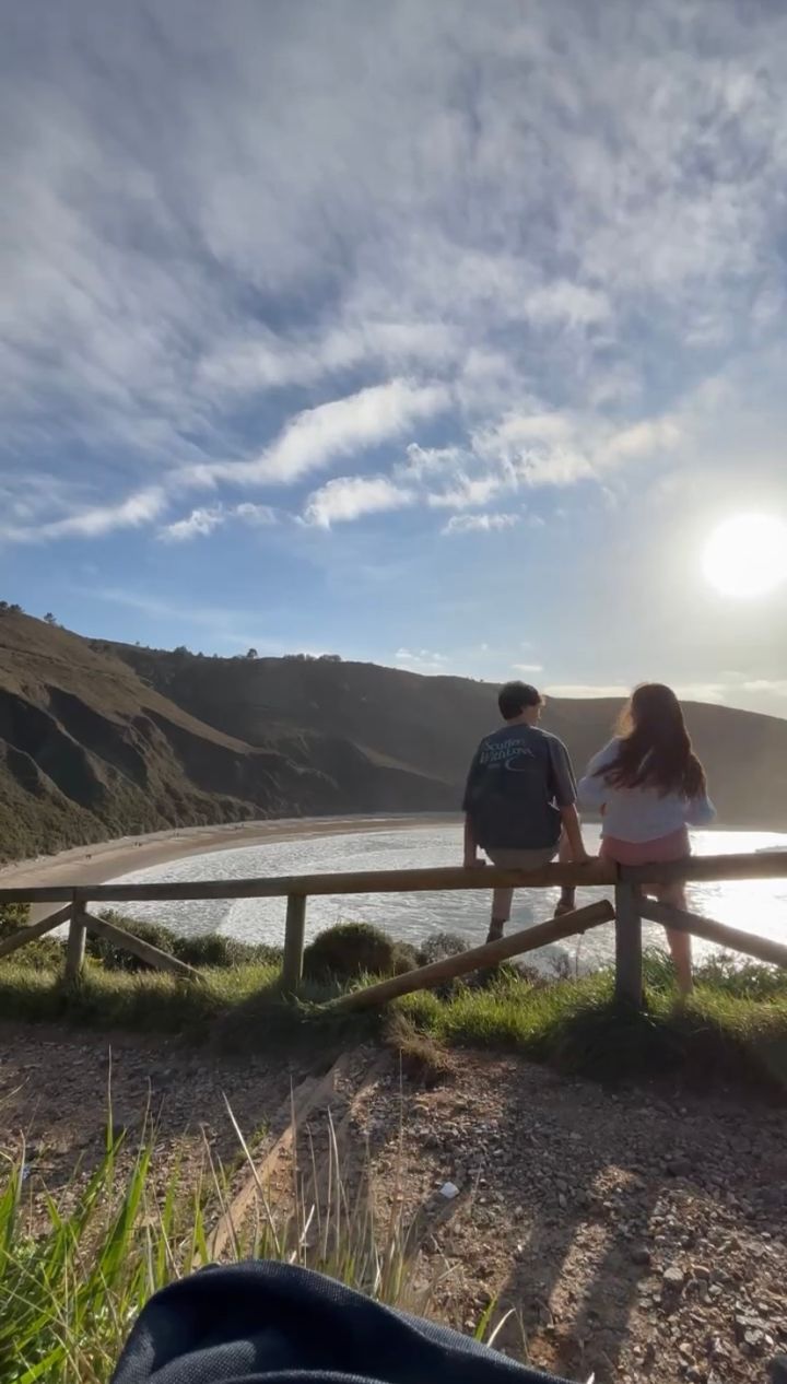 ふたりがやって来たのは、ビーチを眺望できる見晴らしのいいスポット。 ここで絶景を眺めるふたりの後ろ姿を撮影しようとしたらしく、手すりに腰掛けていました。