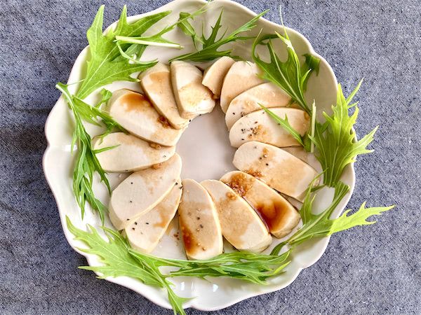 豆腐製品なので、しょうゆのたれがよく合います。また、弾力があるので食べ応えがありますね。まるで冷奴のようですが、少しもっちりしているのでチーズを連想させる感じがあり、イタリア料理にアレンジするのは向いているかもしれませんね。豆腐と違い崩れにくいので、このようにきれいに並べられて見た目もよく、とても簡単ですが立派な1品になりますね。