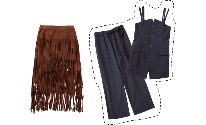 左から:BOHOルックを思わせるフリンジスカートは、ノーブルなブーツと合わせて。スカート¥99,000(ファーリング バイ ジャンニ/ウィム ガゼット ルミネ新宿店)、ミニマムなセットアップはケイト的。ベスト¥49,500、パンツ¥47,300(共にウジョー/エム)