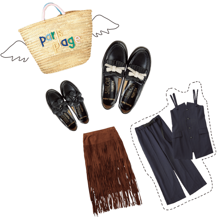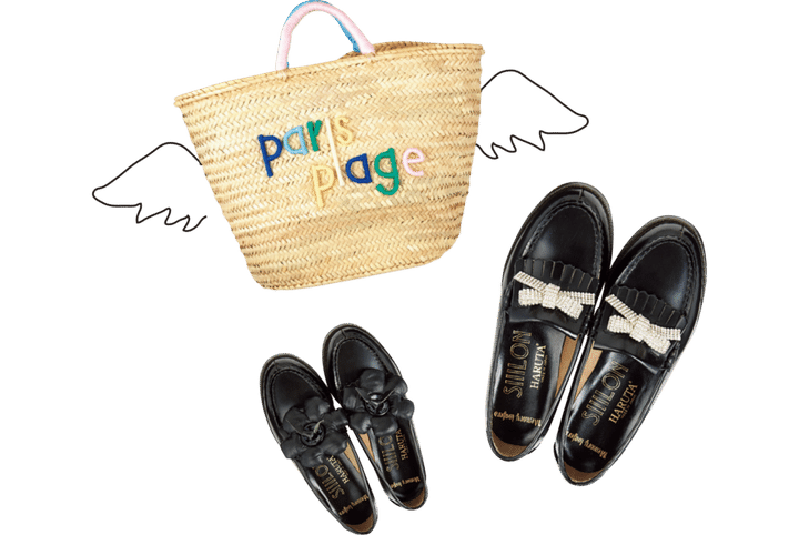 どこかノスタルジックなムードを纏う小物たち。着こなしのハズしにもなってオススメ。上から時計回りに:かごバッグ¥31,900(別注キロメートル パリ/ウィム ガゼット ルミネ新宿店)、ローファー[リボン・フラワー]各¥19,800(共にシローン×HARUTA/シローン)
