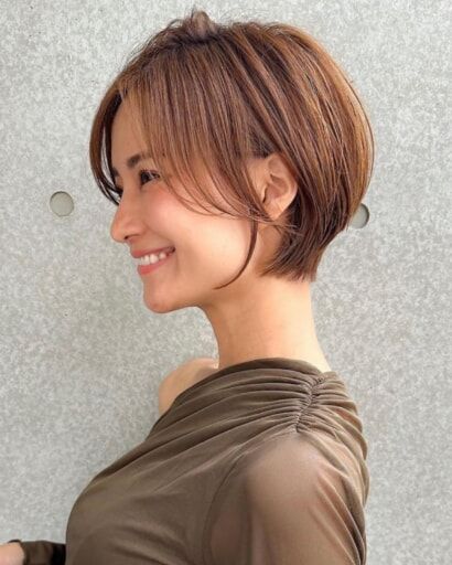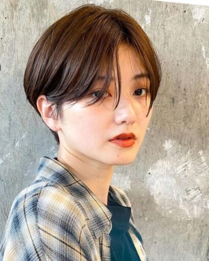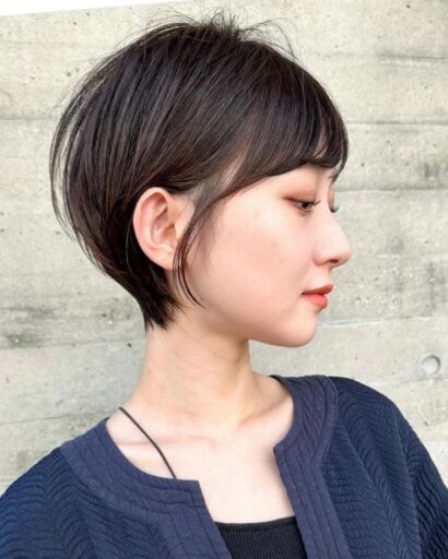 頬骨をカバーする絶妙レングスの前髪がポイントの丸みシルエットのショートヘアに黒髪or暗髪を合わせると、頭全体が引き締まった印象に見せることができますし、より目元印象が強調されて大人のオンナといった雰囲気を醸せます。より抜け感が欲しいなら、くびれスタイリングで髪に動きを出したり、耳出ししたりしましょう。