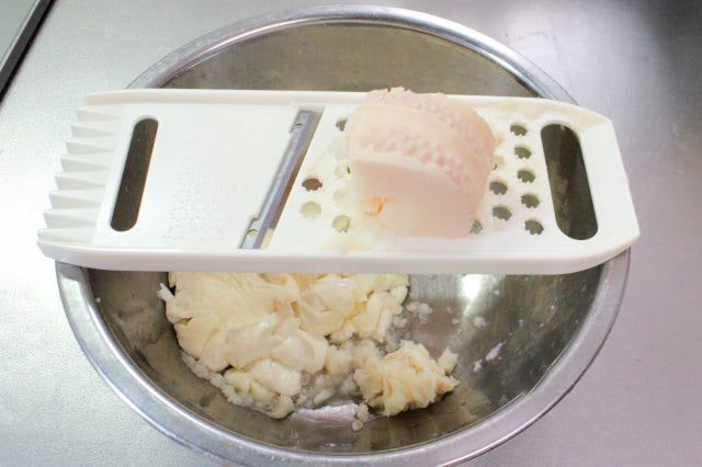 たけのこの下部はすりおろし、上部は角切りにして使います。