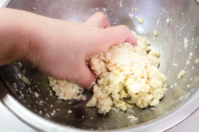 豆腐の水分量によって生地の硬さが異なるので、まとまりにくい場合はパン粉を適量加えて調整します。今回は豆腐の水切りが甘かったようなのでパン粉を大さじ4杯加えて成形しやすい硬さにしました。