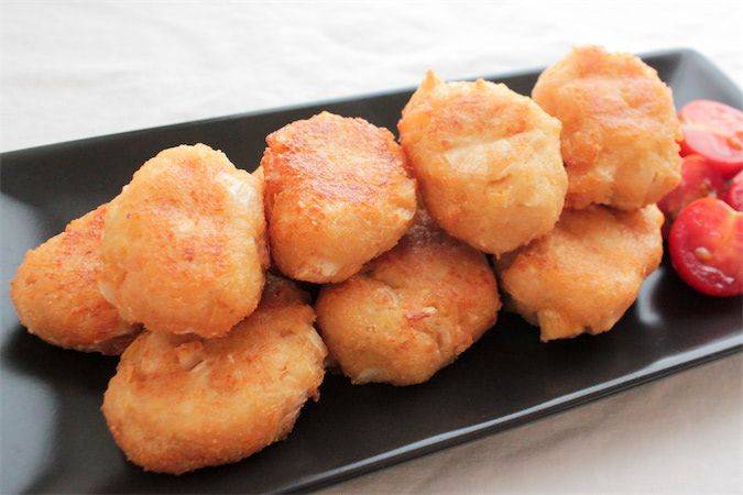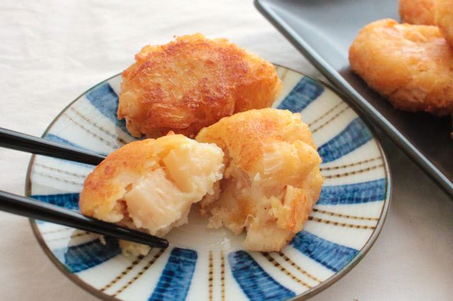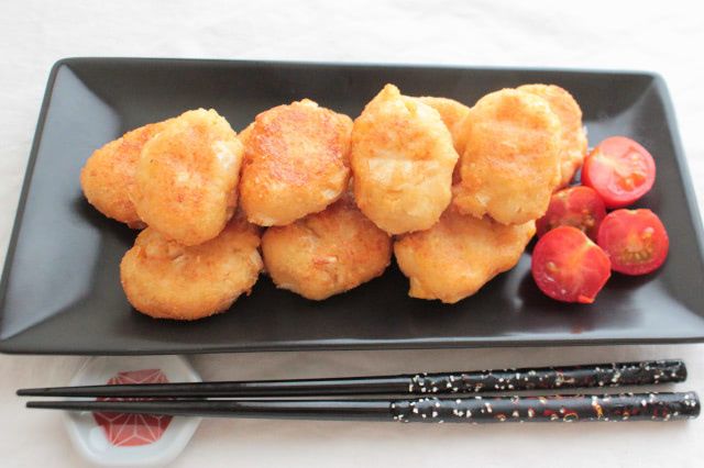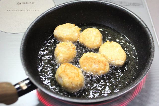 5.フライパンの底から2~3cmほどのサラダ油を入れて170℃くらいに熱し、全体がきつね色になるまで揚げます。