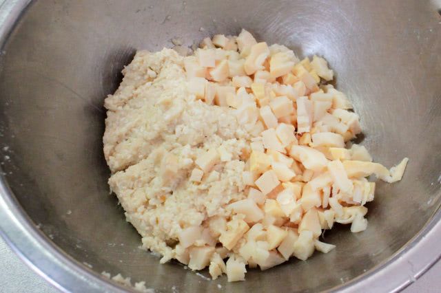 刻んだたけのこを加えると、すりおろしたけのこ入りの豆腐生地と同じくらいの割合になりました。