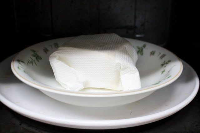 2.  2重にしたキッチンペーパーで包んだ木綿豆腐を耐熱容器に入れ、電子レンジ(600W)で3分加熱して水切りします。