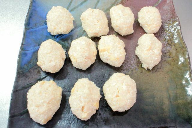 ひと口サイズの楕円形に成形すると、ローソンの「からあげクン」のような形に揚がりますよ。今回は「たけのこクン」を11個成形出来ました。