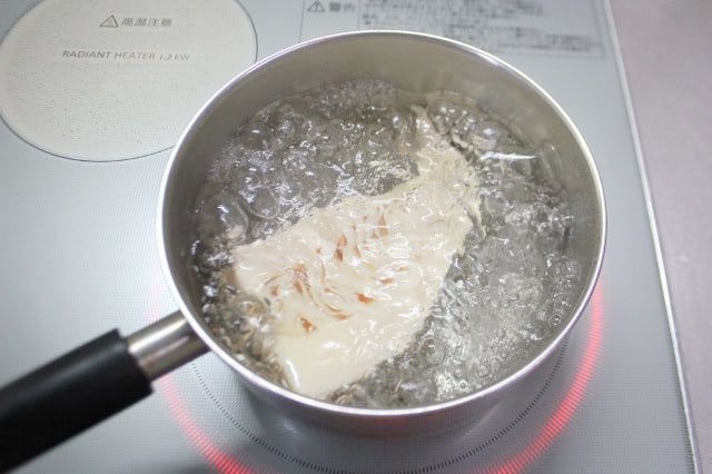 1.  沸騰したお湯で水煮たけのこを3分ほど下茹でします。