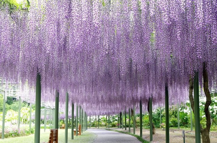 「花のリレー」で見頃となる花は、4月は「フジ(藤)」、5月は「バラ」などとなっています。